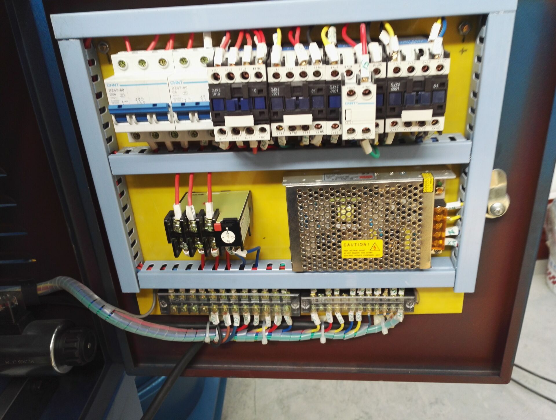 3、在電機啟動后,按下“點動上升”按鈕下模上升,松開“點動上升”按鈕下模停止上升,按下“點動下降”按鈕下模下降,松開“點動下降”按鈕下模停止下降。